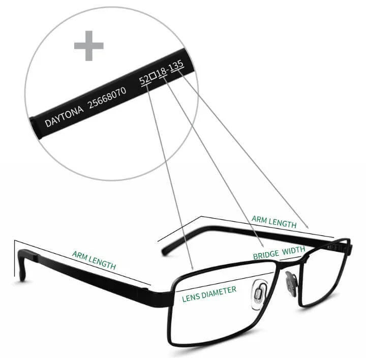 If you look on the inside of your glasses, you'll find a number that looks like: 52 [] 18 135. This information shows you the size of your glasses; the lens diameter, the bridge width and the side length, all measured in millimetres.